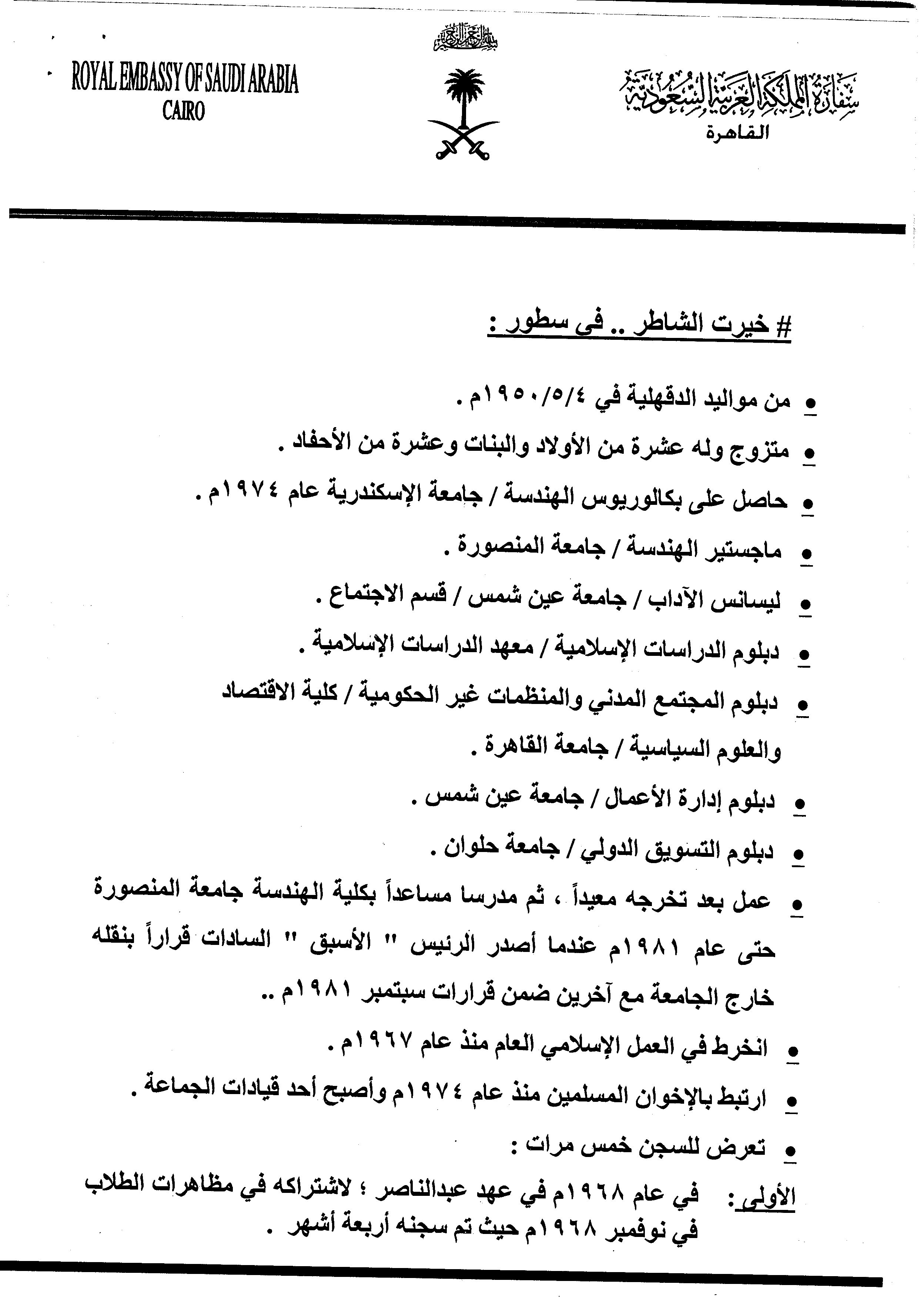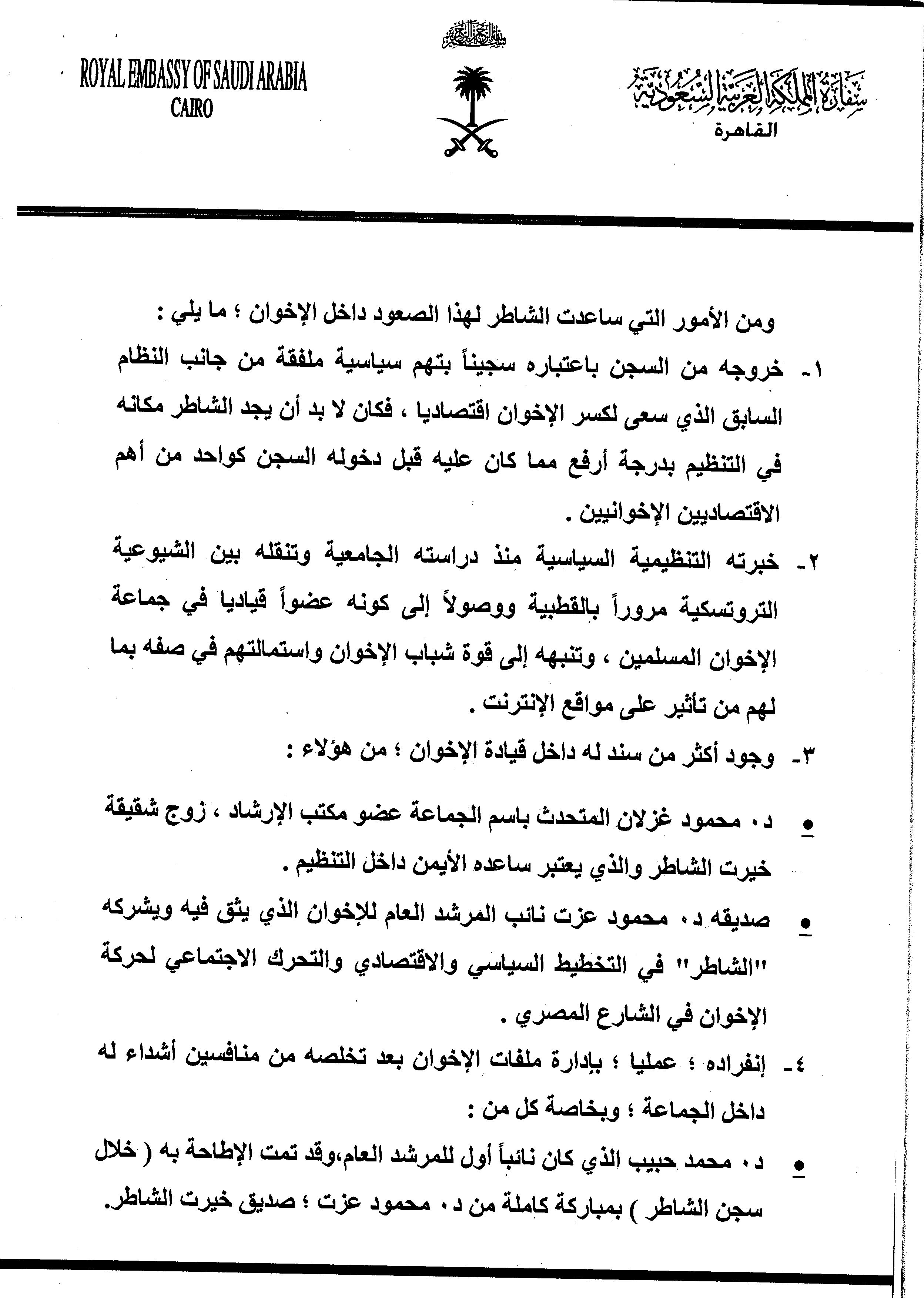 واعتبرت السفارة السعودية، أن الشاطر هو القائد الفعلي للإخوان ومدير العملية السياسية بعد خروجه من السجن، وأنه الأجدر في إجراء مباحثات بين الإخوان والسلطات السعودية.