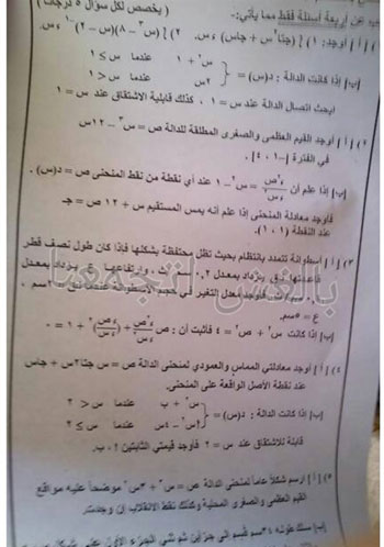 تداول مستخدمو مواقع التواصل الاجتماعي، فيس بوك، اليوم الأربعاء، ورقة امتحان مادة "التفاضل والتكامل"، لطلاب القسم العلمي بالثانوية الأزهرية، وذلك بعد أقل من ساعة من بدء اللجنة.