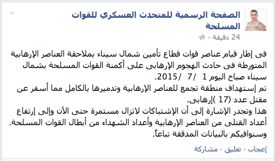 قال المتحدث العسكري، العميد محمد سمير، عبر صفحته الرسمية على «فيس بوك»، إنه في إطار ملاحقة العناصر المتورطة في حادث الهجوم على أكمنة القوات المسلحة بشمال سيناء، صباح اليوم الأربعاء، تم استهداف منطقة تجمع للعناصر وتدميرها بالكامل، مما أسفر عن مقتل 17 منهم.