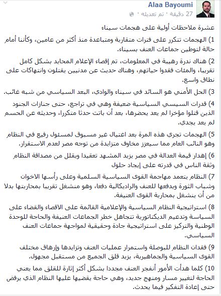 وضع الباحث السياسي، علاء بيومي، عشر ملاحظات أولية على هجمات سيناء، التي وقعت صباح اليوم، بشمال المحافظة، وراح ضحيتها قرابة 80 مجندًا، بحسب بعض التقديرات.