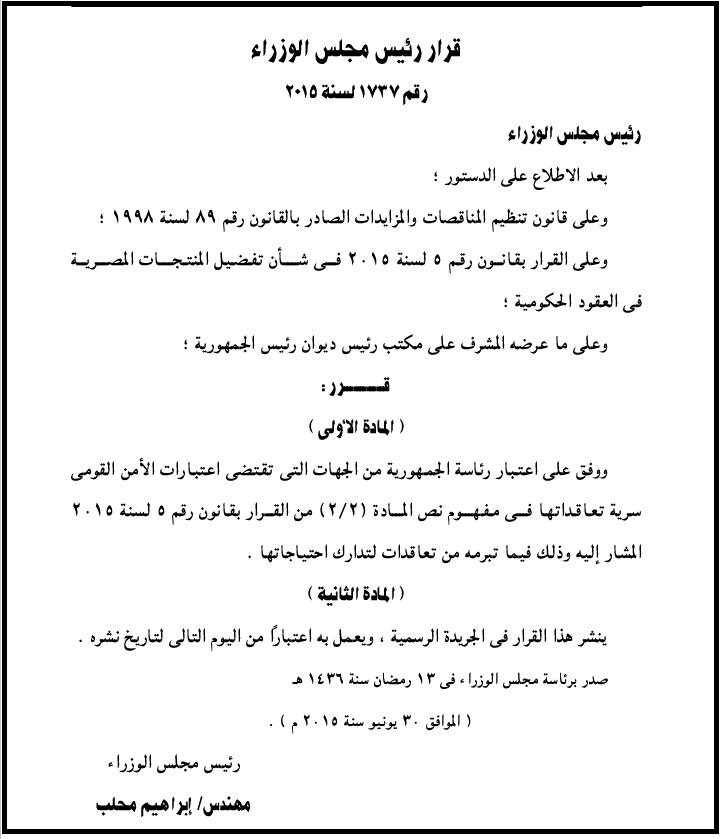 واعتمد مجلس الوزراء في قراره على قانون تنظيم المناقصات والمزايدات الصادر بالقانون رقم 89 لسنة 1998، وعلى القرار بقانون رقم 5 لسنة 2015، في شأن تفضيل المنتجات المصرية في العقود الحكومية.