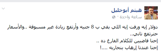 وعلق الناشط الحقوقي، هيثم أبو خليل، مدير مركز ضحايا لحقوق الإنسان، ساخرًا: “دولار إيه وزفت إيه اللي بقي بـ8 جنيهات، وارتفع زيادة غير مسبوقة.. والأسعار حترتفع تاني.. إحنا فاضيين للكلام الفارغ ده.. إحنا عندنا إرهاب بنحاربه..!”.