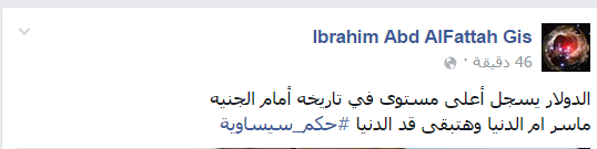 وقال Ibrahim Abd AlFattah Gis: “الدولار يسجل أعلى مستوى في تاريخه أمام الجنيه، ماسر أم الدنيا وهتبقى قد الدنيا”.