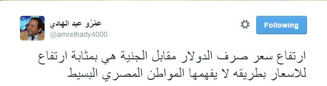 ورأى عَمْرُو عبدالهادي، عضو جبهة الضمير، عبر “تويتر”، “أن ارتفاع سعر صرف الدولار مقابل الجنيه هو بمثابة ارتفاع للأسعار بطريقة لا يفهمها المواطن المصري البسيط”.