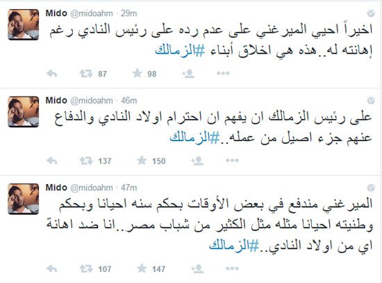وكتب ميدو -على موقع التواصل الاجتماعي “تويتر”- قائلًا: “على رئيس الزمالك أن يفهم أن احترام أولاد النادي والدفاع عنهم جزء أصيل من عمله”.