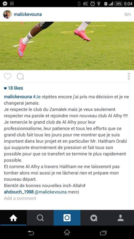 “أكرر مرة أخرى أنني اتخذت قراري ولن يتغير أبدا.. أنا أحترم نادي الزمالك، ولكن أريد فقط أن يحترموا رغبتي، بالانضمام إلى الأهلي، أشكر ذلك النادي الكبير، هو فريقي الجديد، بسبب الصبر الطويل الذي ظهر لي أنني مهم في مشروعهم خاصة هيثم عرابي”.