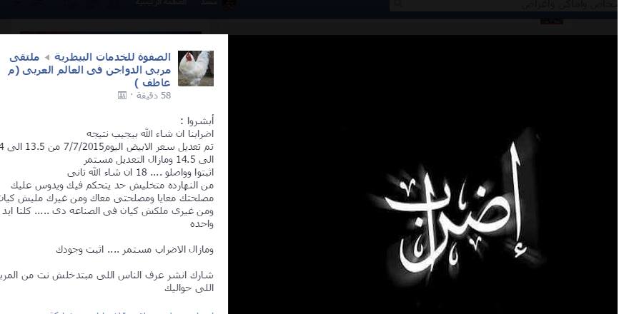 أعلن منتجو الدواجن في مصر، عبر صفحتهم على “فيس بوك”، الدخول في إضراب مفتوح عن بيع أو تربية الدواجن، منذ الأمس ولمدة 3 أيام؛ بسبب ما وصفوه بتعنت الحكومة في خفض الأسعار وجشع السماسرة، والفساد الموجود داخل المنظومة.