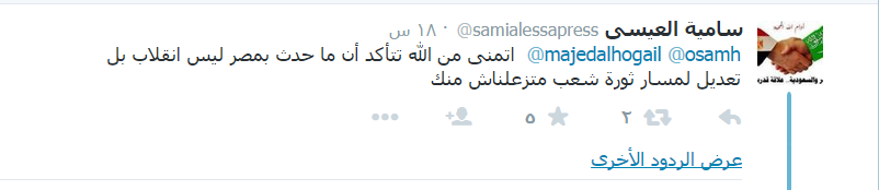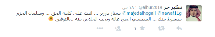 وفي سياق مختلف قال تفكير حر ‏@alhur2019  majedalhogail @nawaf11g: “ممتاز يا وزير.. اثبت على كلمه الحق.. وسلمان الحزم مبسوط منك.. السيسي أصبح عالة ويجب الخلاص منه.. بالتوفيق”.