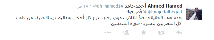 بينما قال Ahmed Hamed‏ إن: “هذه هي الحقيقة فعلاً انقلاب دموي يحاول نزع كل أخلاق وتعاليم ديننا الحنيف من قلوب كل المصريين بتشويه صورة المتدينين”.