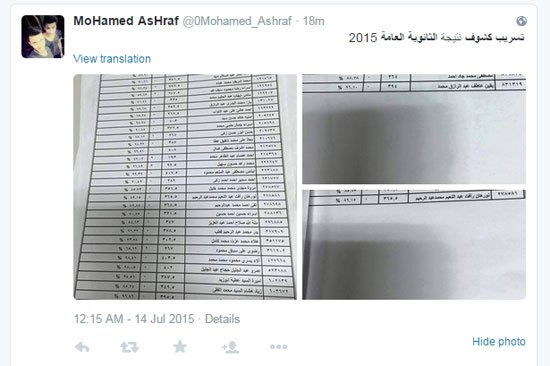 تداول عدد من رواد موقع التواصل الاجتماعي "تويتر"، صورًا قالوا إنها مسربة لكشوف نتيجة الثانوية العامة للعام 2015.