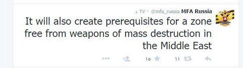 وفي تغريدة أخرى، قالت الخارجية الروسية: “سيتم إنشاء الشروط الأساسية لإنشاء منطقة خالية من أسلحة الدمار الشامل في الشرق الأوسط”.