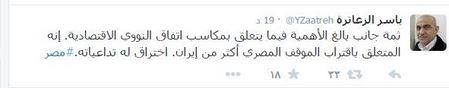 وعلق الكاتب والمحلل السياسي الفلسطيني ياسر الزعاترة قائلًا: “ثمة جانب بالغ الأهمية فيما يتعلق بمكاسب اتفاق النووي الاقتصادية، إنه المتعلق باقتراب الموقف المصري أكثر من إيران، اختراق له تداعياته ،#مصر”.