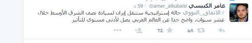 وعلق آخرون من الدول العربية، منهم عامر الكبيسي بقوله: “الاتفاق النووي حالة إستراتيجية ستنقل إيران لسيادة نصف الشرق الأوسط خلال عشر سنوات، واضح جدًا عن العالم العربي يصل لأدنى مستوى للتأثير”.