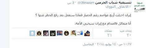 وقال حساب “تنسيقية شباب الحرمين”: “إيران احتلت أربع عواصم رغم الحصار، فماذا ستفعل بعد رفع الحظر عنها؟.. أنا متفائل؛ فالصدام مع إيران سيحيي الأمة”.