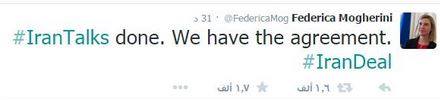 أما وزير الخارجية الأميركي، فقد أعاد تغريدة موغريني كإعلان عن التوصل لاتفاق مع إيران بشأن برنامجها النووي.