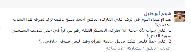 وتساءل الناشط الحقوقي، هيثم أبو خليل، قائلًا: “بعد الاعتداء اليوم في تركيا على القارئ الدكتور أحمد نعينع، كيف ترى تصرف هذا الشاب المصري؟”.