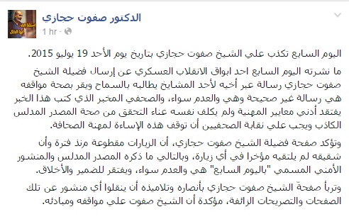 وقالت الصفحة الرسمية للدكتور صفوت حجازي:”ما نشرته اليوم السابع أحد أبواق الانقلاب العسكري عن إرسال فضيلة الشيخ صفوت حجازي رسالة عبر أخيه لأحد المشايخ يطالبه بالسماح ويقر بصحة مواقفه هي رسالة غير صحيحة وهي والعدم سواء، والصحفي المخبر الذي كتب هذا الخبر يفتقد أدني معايير المهنية ولم يكلف نفسه عناء التحقق من صحة المصدر المدلس الكاذب ويجب علي نقابة الصحفيين أن توقف هذه الإساءة لمهنة الصحافة”.