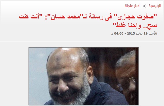 نفت الصفحة الرسمية للدكتور صفوت حجازي ما نشرته صحيفة "اليوم السابع" اليوم بشأن إرساله لرسالة من داخل محبسه، طالب فيها الشيخ محمد حسان بأن يسامحه على مواقفه.