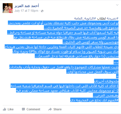 وكتب أحمد عبد العزيز لطلاب الثانوية العامة قائلا: “لو انت أدبي ومجموعك مش جايب كلية تشغلك بعدين أو لو انت علمي وماجبتش مجموع طب وهندسة خد مني النصيحة الصغيرة دي.. فيه كلية اسمها آداب فيها قسم جغرافيا جواه شعبة مساحة أو مساحة وخرائط”.