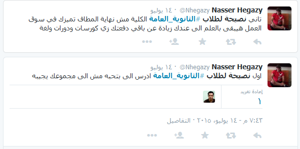 وقدم Nasser Hegazy نصيحتين لطلاب الثانوية العامة، حيث قال: “أول نصيحة لطلاب الثانوية العامة ادرس اللي بتحبه مش اللي مجموعك يجيبه”.