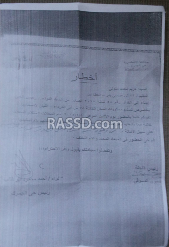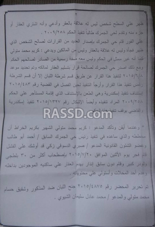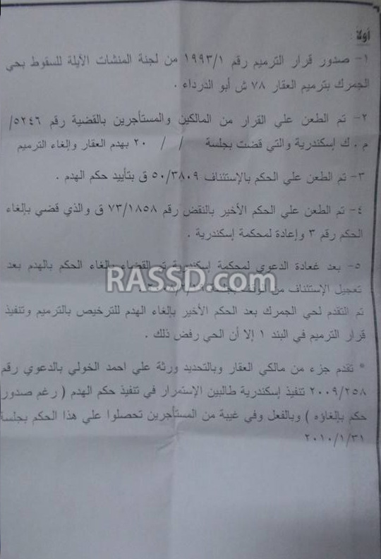 واتصل الأهالي بمحافظ الإسكندرية الذي أفادهم بأن العقار صادر له قرار إزالة في وقت سابق، ولكن أكد السكان أن القرار قد تم الطعن عليه ولديهم ما يفيد ذلك من مستندات بالقضية رقم 5246 م.ك إسكندرية والتي قضت بعدم هدم العقار وإلغاء الأمر السابق.