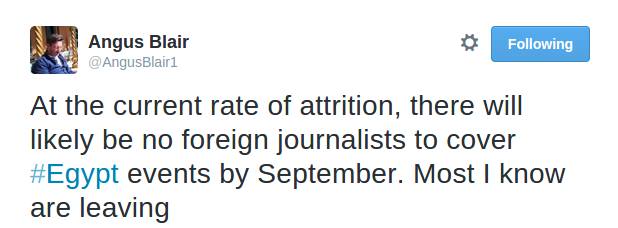 وقال بلير عبر حسابه الشخصي على موقع التدوين المصغر “تويتر”: “في المعدل الحالي من الاستهلاك، من المرحج ألا يكون هناك صحفيون لتغطية أحداث مصر بحلول سبتمبر المقبل. معظم من أعرفهم يغادرون”.
