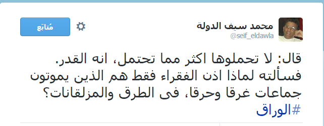 وقال سيف الدولة، في تغريدة عبر حسابه على موقع “تويتر”: “قال لا تحملوها أكثر مما تحتمل، إنه القدر، فسألته لماذا إذن الفقراء فقط هم الذين يموتون جماعات غرقًا وحرقًا فى الطرق والمزلقانات؟”.
