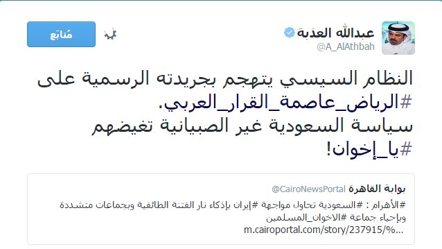ونشر العذبة، في تغريدة له عبر موقع “تويتر”، خبرا من صحيفة الأهرام، انتقدت فيه تغيير السياسة السعودية تجاه جماعة الإخوان المسلمين، معلقا عليه بقوله: “نظام السيسي يتهجم بجريدته الرسمية على الرياض عاصمة القرار العربي.. سياسة السعودية غير الصبيانية تغيظهم يا إخوان”.