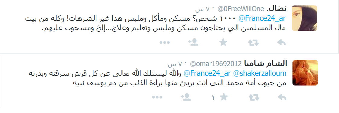 وفي سياق آخر وتعليقا على العدد المصاحب للملك، استنكرت نضال @FreeWillOne وهي مواطنة سعودية، على الملك سالمان صحبته لـ100 من حاشيته قائلة “١٠٠٠ شخص؟ مسكن ومأكل وملبس هذا غير الشرهات! وكله من بيت مال المسلمين اللي يحتاجون مسكن وملبس وتعليم وعلاج.. إلخ ومسحوب عليهم”، بينما قال حساب يدعى الشام شامنا: “والله ليسألك الله تعالى عن كل قرش سرقته وبذرته من جيوب أمة محمد التي انت بريء منها براءة الذئب من دم يوسف نبيه”.