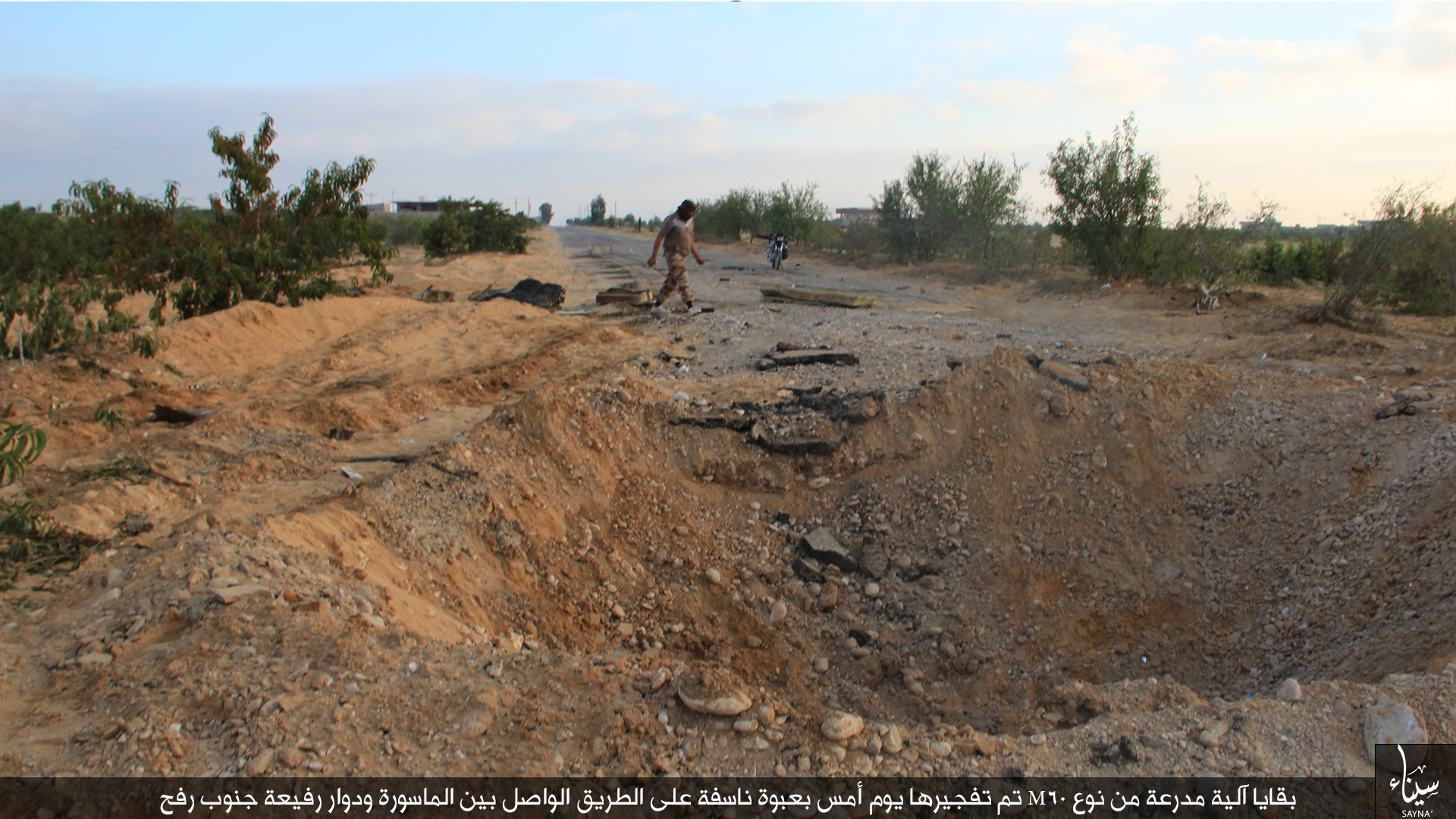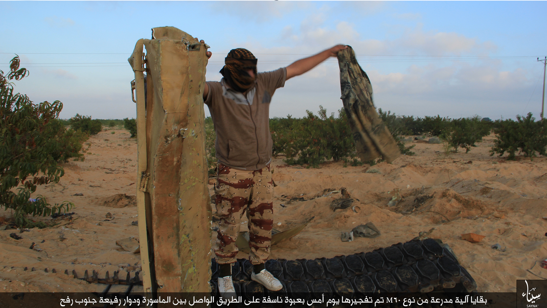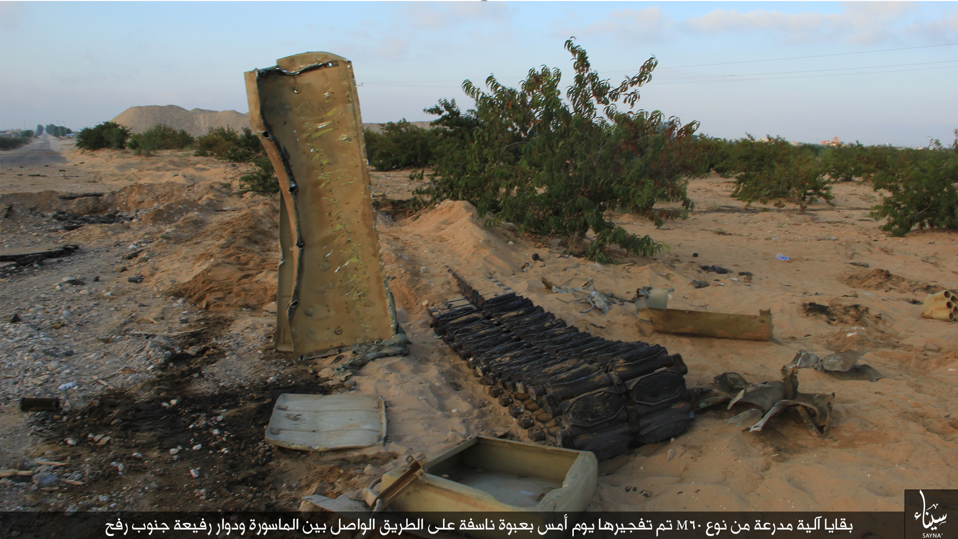 نشر تنظيم “ولاية سيناء”، منذ قليل، صورًا تثبت نسفه آلية مدرعة من نوع “M60″، وذلك تحت شعار “دولة الخلافة بولاية سيناء”.