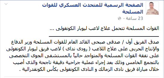 وقال المتحدث العسكري: (صدَّق الفريق أول صدقي صبحي، القائد العام للقوات المسلحة وزير الدفاع والإنتاج الحربي، على علاج اللاعب “رودي نداي” لاعب فريق ليوبار الكونغولي على نفقة القوات المسلحة والمتواجد حاليًا بالمستشفى الجوي التخصصي بالتجمع الخامس؛ وذلك بعد إجراء عملية جراحية دقيقة ناجحة، والذي أصيب خلال مباراة فريق نادي الزمالك والنادي الكونغولي بكأس الكونفدرالية).