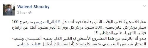 وقال “شرابي” في منشور عبر صفحته الرسمية موقع التواصل الاجتماعي “فيس بوك”، متعجباً من ارتفاع أسعار فواتير الكهرباء، لسد حاجة الدولة المادية، برغم قناة السويس الجديدة،: “مفارقة عجيبة ففي الوقت الذي يعلنون فيه أن دخل #قناة_السويس سيصبح 100 مليار دولار كل عام بمعنى 300 مليون دولار كل يوم الا أنهم يعلنون أيضا عن ارتفاع فواتير الكهرباء على المواطن.