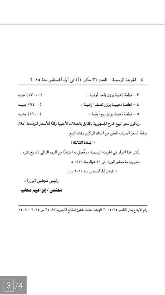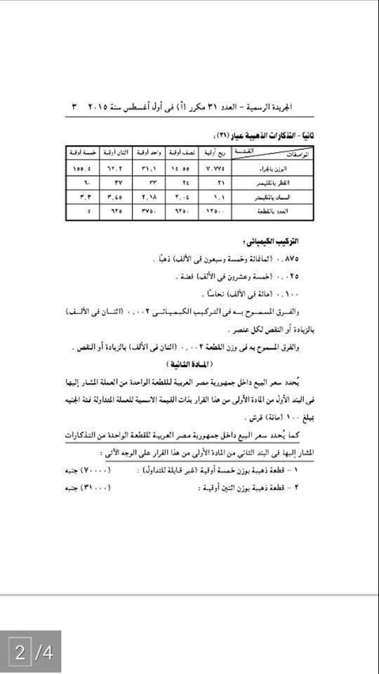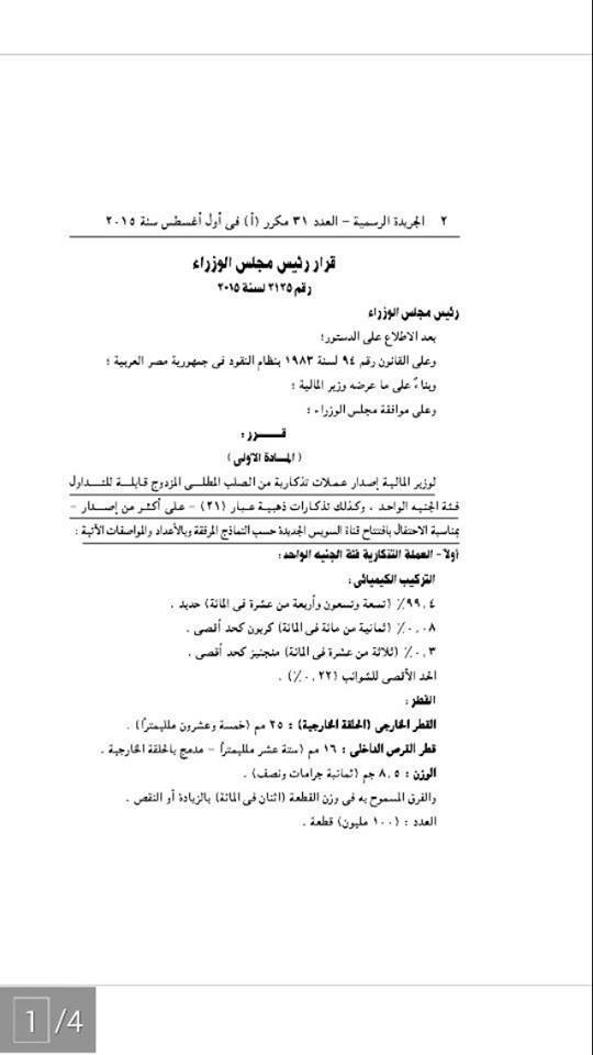 ونشرت الجريدة، أمس السبت، قرارًا من رئاسة مجلس الوزراء، قيل فيه إنه بعد الاطلاع على دستور البلاد، وعلى القانون رقم 94 لسنة 1983 بنظام إصدار النقود في مصر، وبعد موافقة وزير المالية ورئيس الوزراء، قررت الحكومة إصدار عملات كتذكارات ذهبية عيار “21”.
