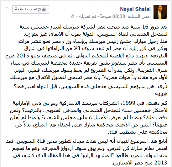 انتقد الدكتور نائل الشافعي، مدير موسوعة “المعرفة” والمحاضر في معهد “ماساتشوستس” للتقنية، اتفاقية حق امتياز المدخل الشمالي لقناة السويس الذي وقعته الحكومة المصرية مع شركة “ميرسك” الدنماركية للملاحة في عام 1999، والذي ينص على الحصول على حق امتياز المدخل الشمالي للقناة لمدة 50 عامًا.