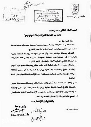 تداول أعضاء هيئة التدريس بالجامعات المصرية، على موقع التواصل الاجتماعي “فيس بوك”، صورة ضوئية لقرار الدكتور جابر نصار، رئيس جامعة القاهرة، أن مجلس الجامعة بجلسته الأخيرة، قرر الموافقة على أن يطبق دفع 10000 جنيه “عشرة آلاف جنيه”، كتبرع من كل عضو هيئة تدريس والأستاذ المتفرغ وأعضاء الهيئة المعاونة يرغب في السفر تحت أي مسمى “إعارات، مرافقة للزوج، إجازة بدون مرتب، ندب كامل”، وذلك من السنة الأولى حتى السنة العاشرة.