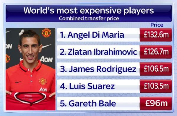 ونشرت “سكاي سبورتس” البريطانية تقريرًا تبرز من خلاله أغلى الصفقات للاعب، وجاء دي ماريا في المقدمة بمبلغ 132.6 مليون جنيه إسترليني، متفوقًا على السويدي زلاتان إبراهيموفيتش مهاجم باريس سان جيرمان، الذي بلغ مجموع انتقالاته مبلغ 126.7 مليون جنيه إسترليني.
