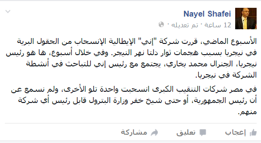 وقال -عبر منشور له على “فيس بوك”- إن شركة “إني” الإيطالية، قررت الأسبوع الماضي، الانسحاب من الحقول البرية في نيجريا بسبب هجمات ثوار دلتا نهر النيجر.