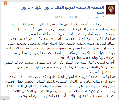 وذكرت أسرة “الملك السابق”، في بيان أصدرته الأحد الماضي، عبر الصفحة الرسمية للملك فاروق على موقع “فيس بوك”، “أنه نظرًا لعدم تلقي الملك السابق دعوة رسمية لحضور حفل افتتاح التفريعة الجديدة حتى الآن، قرر اعتبار الدعوة الشفهية المنقولة له عبر الشركة المنظمة للاحتفالية، والتي قيل إنها بتكليف من مكتب الرئاسة، شائعة ليس لها أساس من الصحة، ولا يعلم مقصد مطلقها إلا الله”.