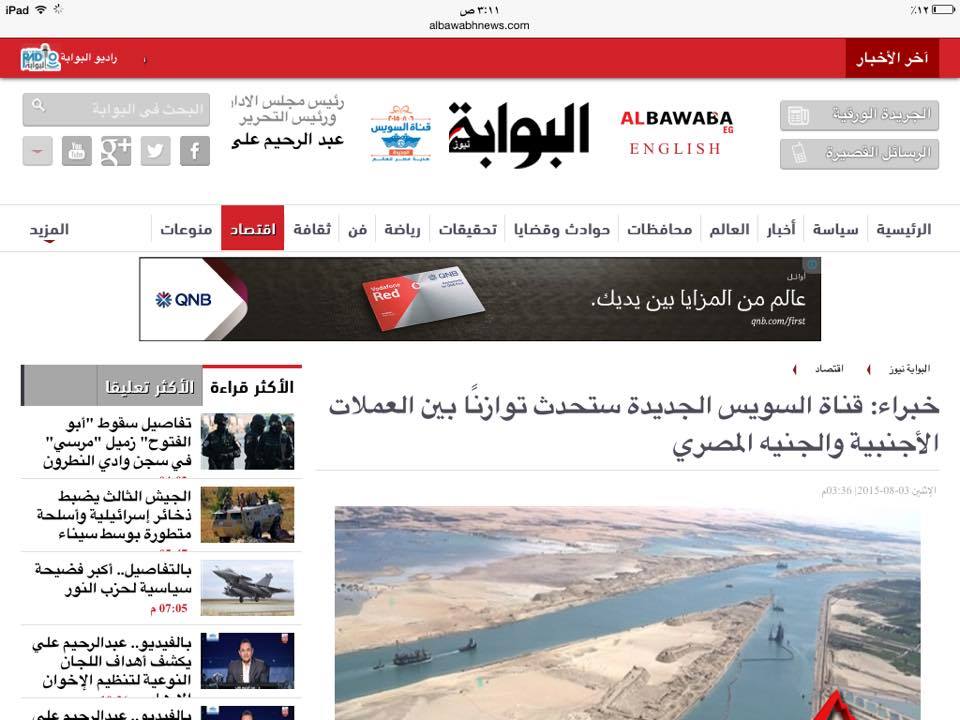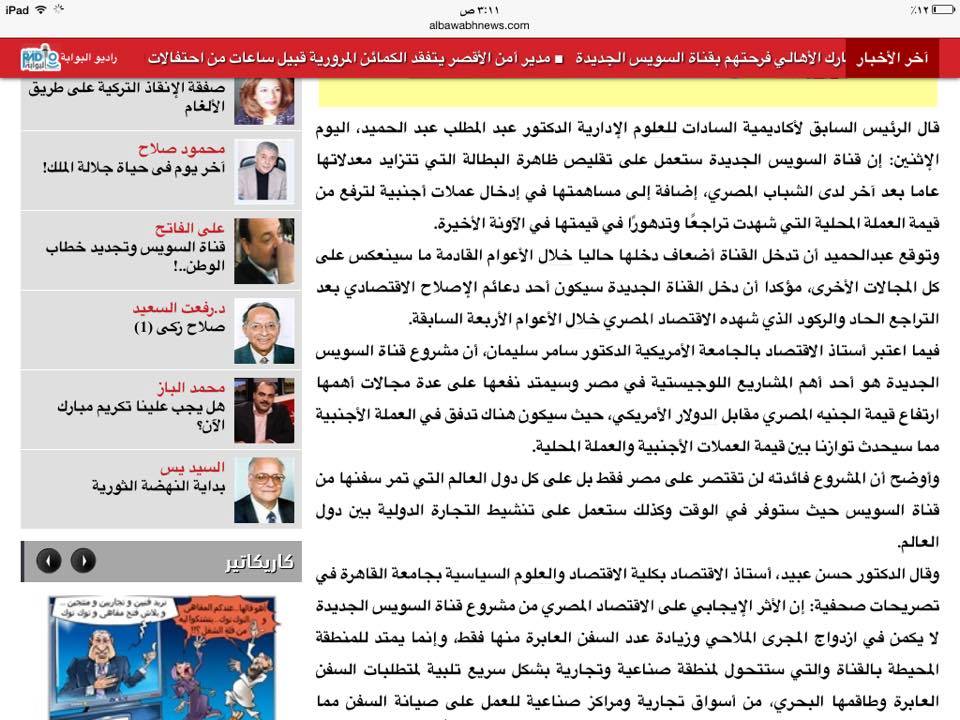 نشرت صحيفة "البوابة نيوز" التي يرأس تحريرها الصحفي عبدالرحيم علي المقرب من الأجهزة الأمنية، تصريحًا خاصًا من أستاذ الاقتصاد بالجامعة الأميركية الدكتور سامر سليمان المتوفى منذ عام 2012، يتحدث فيه عن أهمية تفريعة قناة السويس