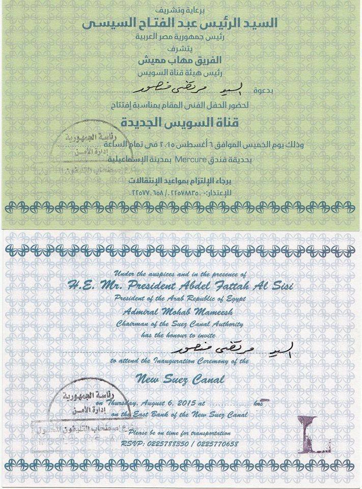 فضيحة جديدة لحقت بمنظمي حفل افتتاح تفريعة قناة السويس الجديدة؛ إذ اشتملت الدعوة التي تم توجيهها إلى الشخصيات العامة، لحضور حفل افتتاح التفريعة الجديدة لقناة السويس، اليوم الخميس، على 5 أخطاء لغوية..