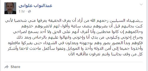 وأضاف -في تدوينة له على “فيس بوك”- “كبلوني من يدي أنا وإخوتي وانهالوا علينا بالرصاص، وبعد ذلك فكونا وبدأ المصور يصور وهم يوجهونهم ويعدلون في الشهداء حتى يفبركوا ما فعلوه وأخذونا جميعًا إلى أمن الدولة وأخذوا الموبايل”.
