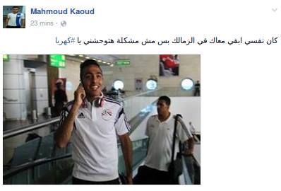 وغازل قاعود، زميله محمود كهربا الذي انتقل مؤخرًا إلى الزمالك، بصورة على موقع التواصل الاجتماعي “فيس بوك”، “كان نفسي أبقى معاك في الزمالك بس هتوحشني يا كهربا”.
