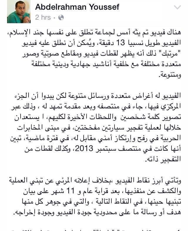 وكتب “يوسف” منشورًا مطولاً عبر صفحته الرسمية على موقع “فيس بوك” حول مقطع الفيديو المتداول، قال فيه: “هناك فيديو تم بثه أمس لجماعة تطلق على نفسها جند الإسلام، الفيديو طويل نسبيا 13 دقيقة، ويُمكن أن نطلق عليه فيديو “مرتبك” ذلك أنه يظهر لقطات فيديو ومقاطع صوتية وصور متعددة مختلفة مع خلفية أناشيد جهادية ودينية مختلفة ومتنوعة”.
