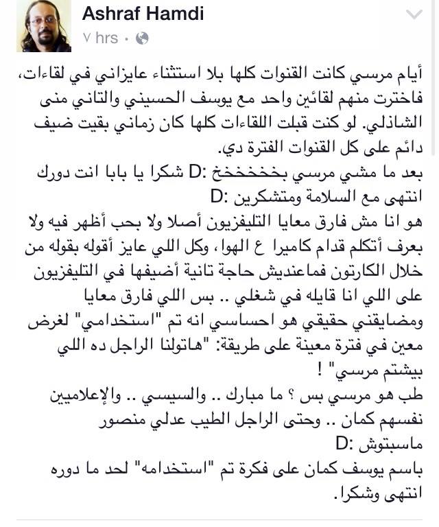 وتابع “حمدي” منشوره قائلا: “طب هو مرسي بس؟ ما مبارك.. والسيسي.. والإعلاميين نفسهم كمان.. وحتى الراجل الطيب عدلي منصور ماسبتوش، باسم يوسف كمان على فكرة تم “استخدامه” لحد ما دوره انتهى وشكرا”.
