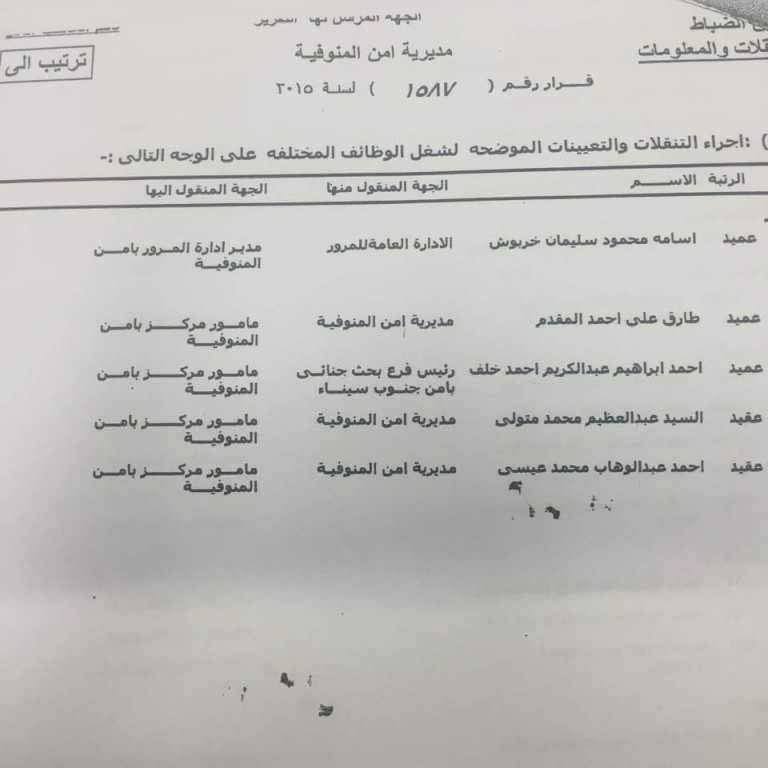 قامت وزارة الداخلية، بحركة تنقلات شملت 65 ضابطًا من وإلى محافظة المنوفية.