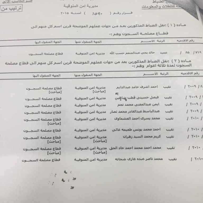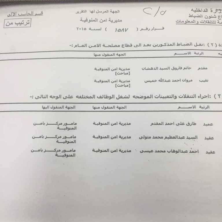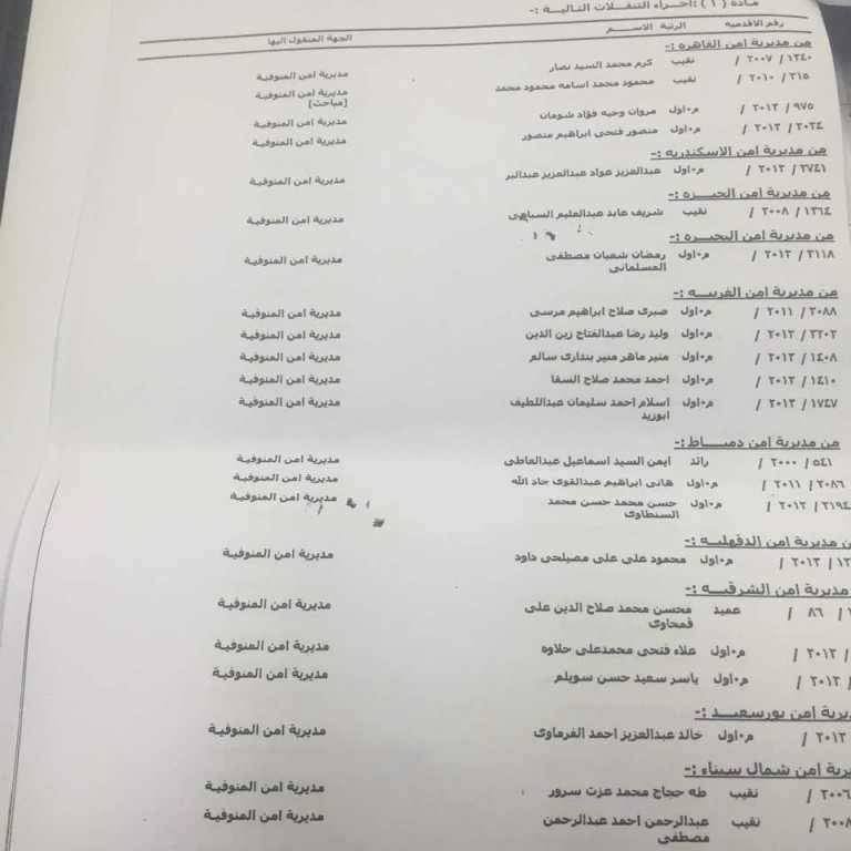 وشملت الحركة أيضًا، نقل المقدم حاتم الدهشان، رئيس مباحث قويسنا، إلى جهاز الأمن العام، والرائد مروان خميس، وكيل تنفيذ الأحكام بالمديرية، إلى إدارة جهاز الأمن العام.