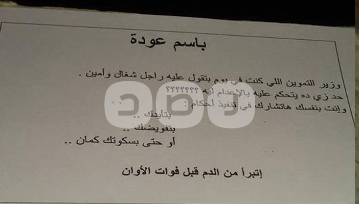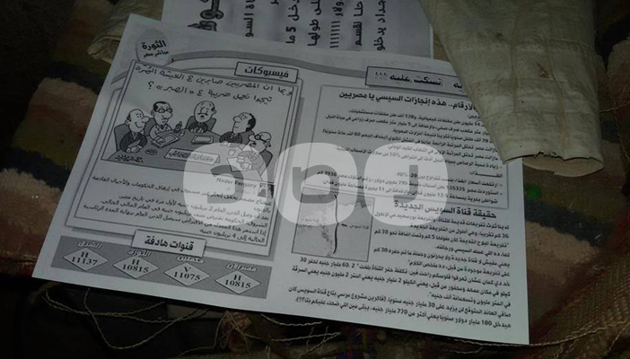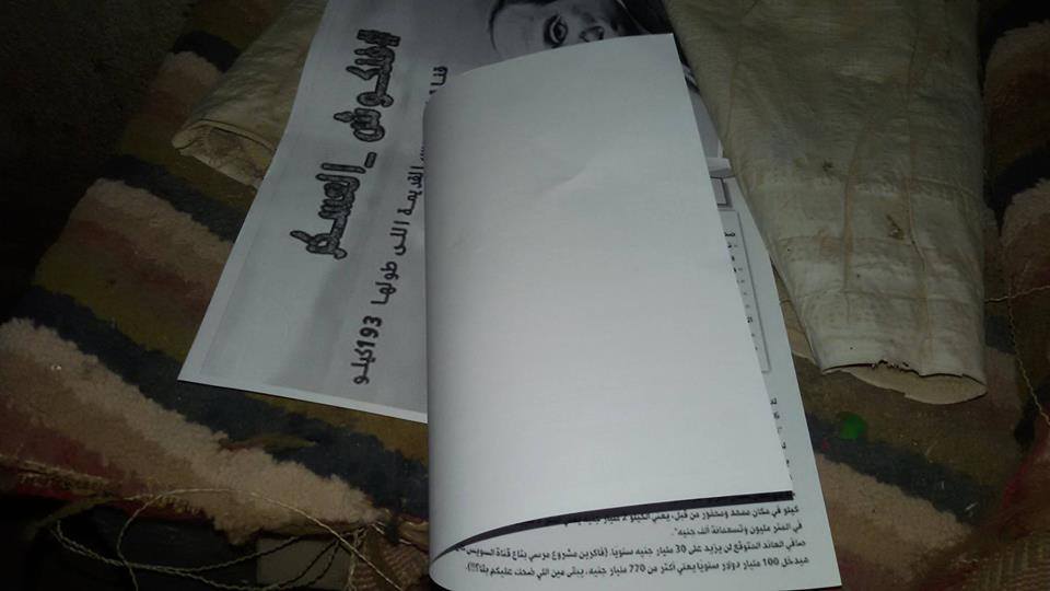 وكانت اللافتات عن وزير التموين باسم عودة وعن مشروع قناة السويس الوهمي مرفق برسم بياني توضيحي لخداع العسكر للشعب.