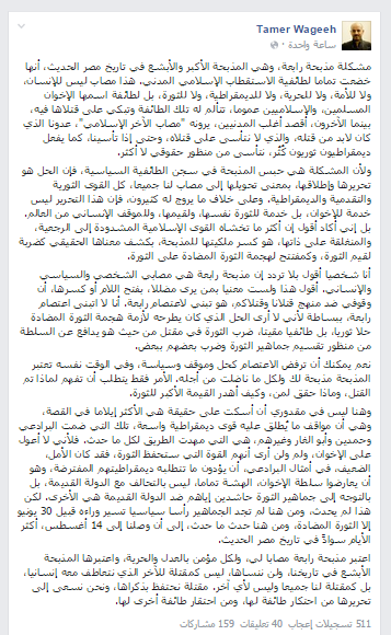 وأكد ما يعنيه بقوله: “نعم يمكنك أن ترفض الاعتصام كحل وموقف وسياسة، وفي الوقت نفسه تعتبر المذبحة مذبحة لك ولكل ما ناضلت من أجله؛ الأمر فقط يتطلب أن تفهم لماذا تم القتل؟ وماذا حقق لمن؟ وكيف أهدر القيمة الأكبر للثورة؟”.