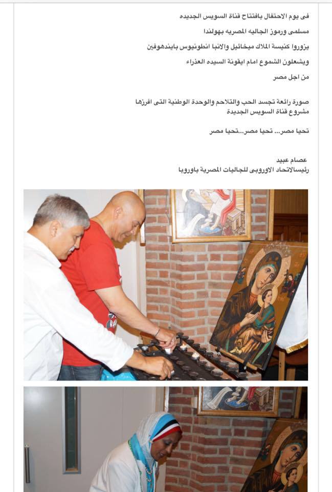 ويقول أحد أعضاء الجالية المصرية، وهو طالب جامعي يدرس بهولندا، وكان دائما يستقبل تهاني بالمناسبات على عنوان بريده الإلكتروني الخاص بالجامعة، من الهيئة القبطية الهولندية، إنه تفاجأ بعنوان بريد إلكتروني يسمى عصام عبيد، يراسله للترويج “للاتحاد الأوروبي للجالية المصرية“.