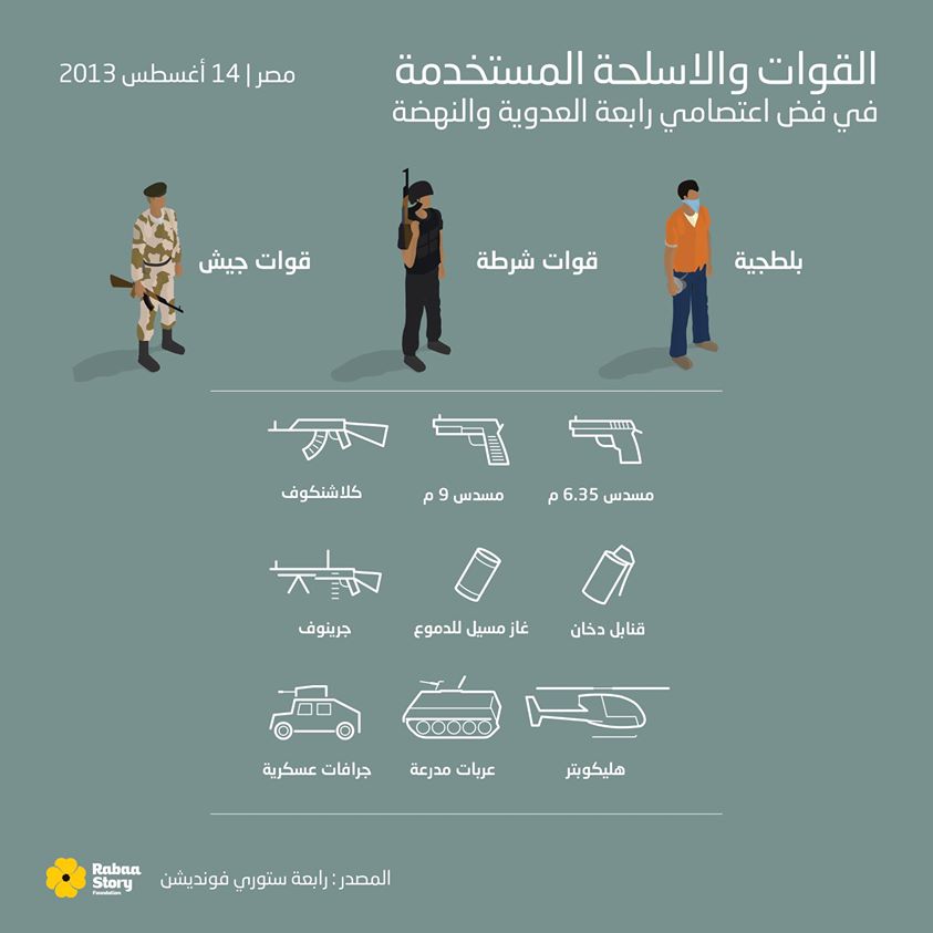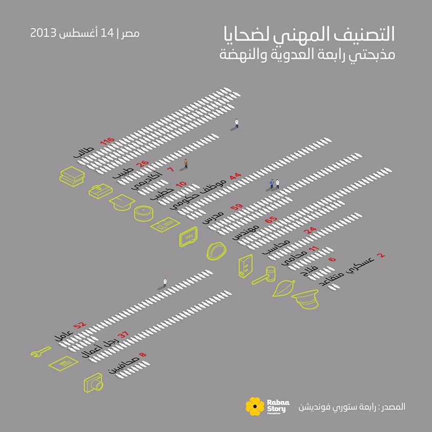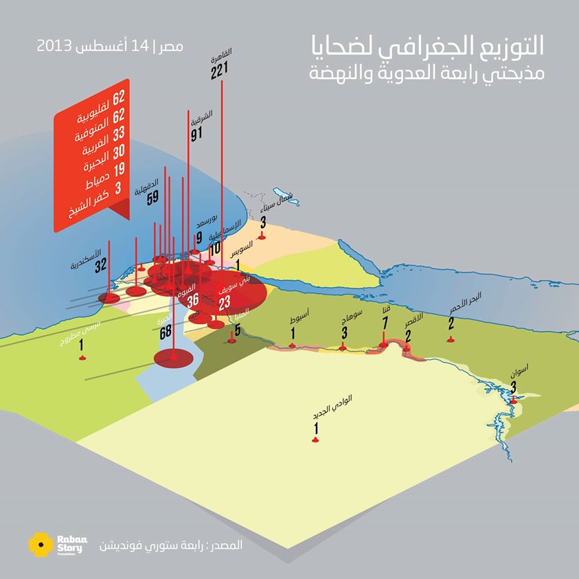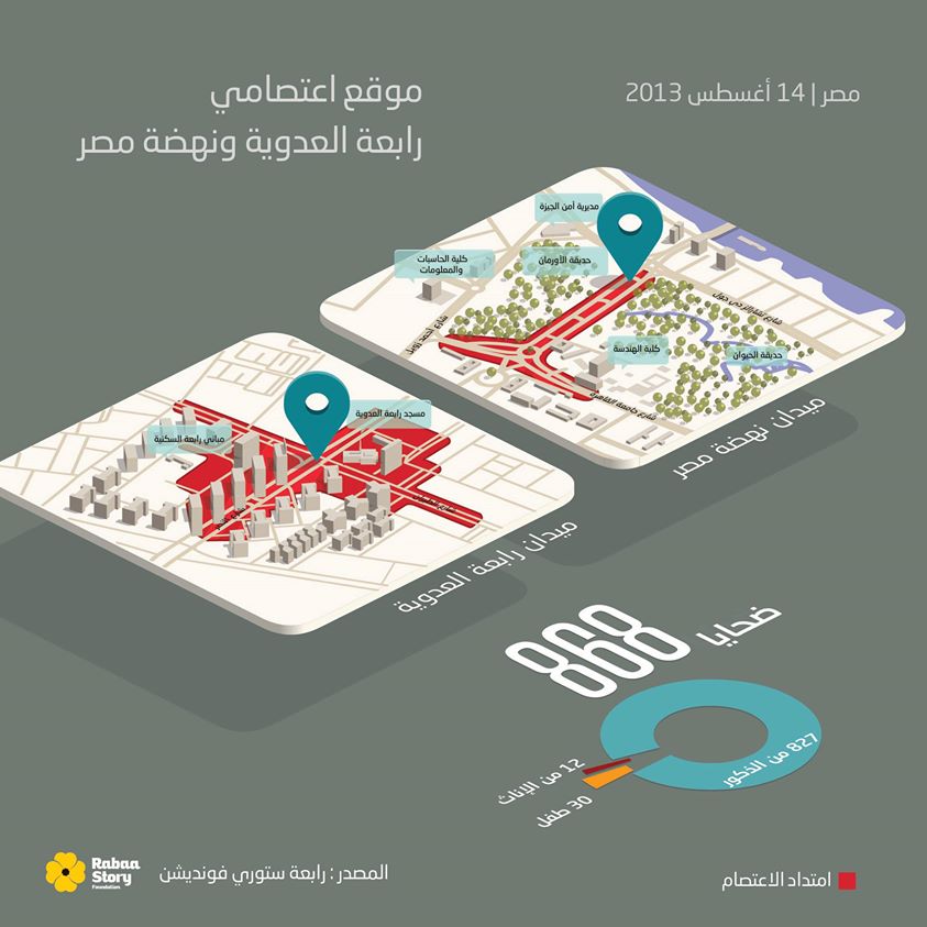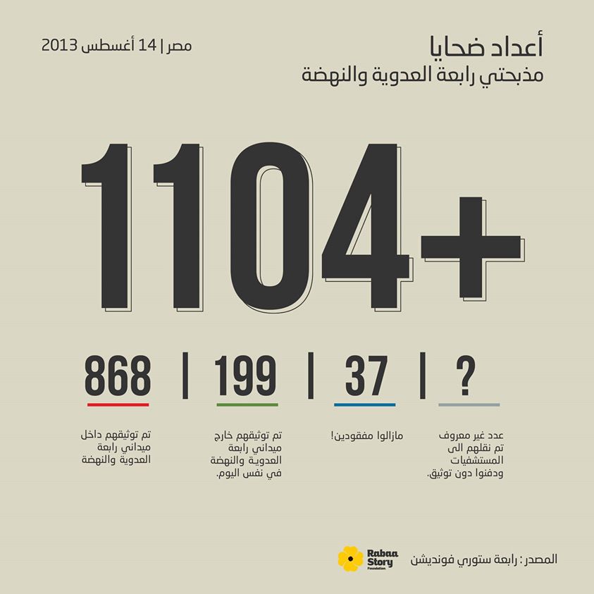 أعلنت مؤسسة “رابعة ستوري”، عن تقريرها للحصر الأولي لضحايا مذبحتي فض اعتصامي “رابعة العدوية” و”النهضة”؛ حيث رصدت وحدة التوثيق بيانات ومعلومات كاملة لعدد 1104 ضحايا، انقسمت إلى 868 ضحية سقطوا خلال عملية الفض داخل ميداني رابعة العدوية ونهضة مصر، إضافة إلى 199 ضحية سقطوا في التظاهرات التي تمت في اليوم نفسه خارج ميداني الاعتصام في القاهرة والمحافظات، بينما سجلت وحدة التوثيق 37 حالة لمفقودين من المعتصمين داخل الميدانين.